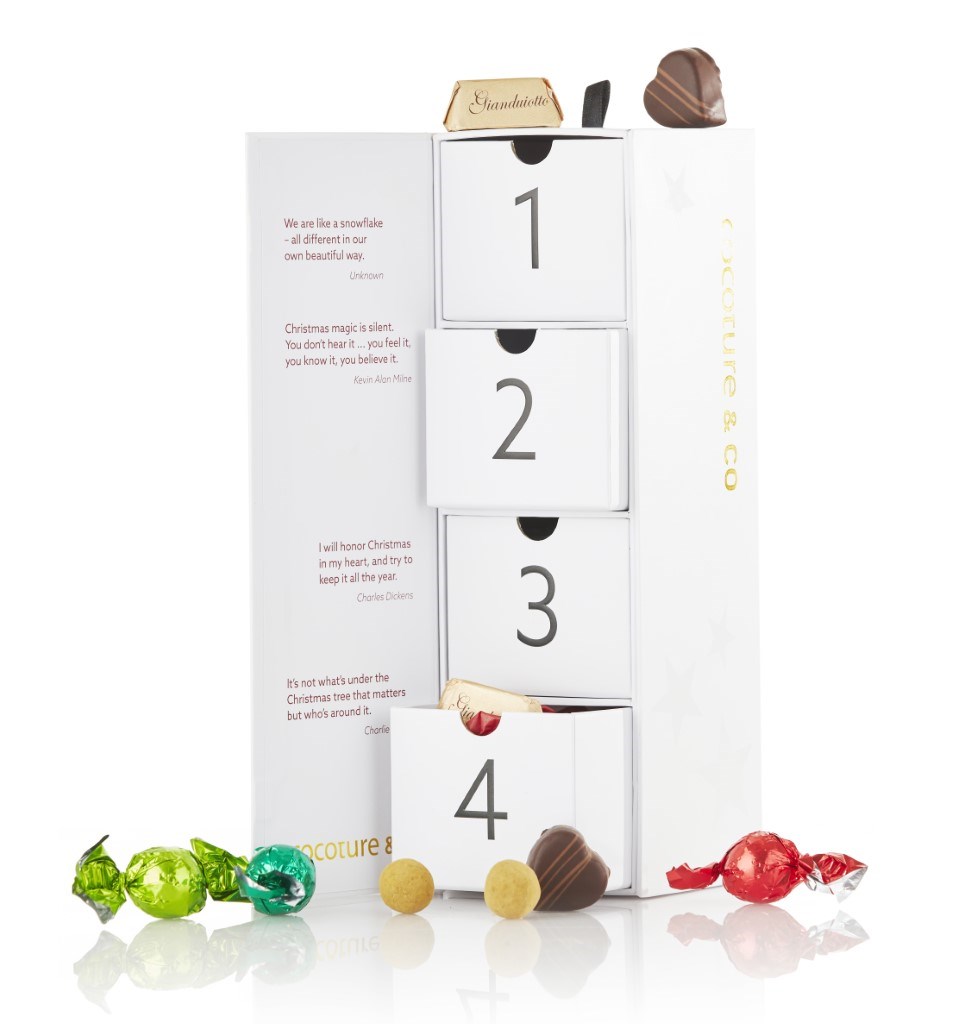 Forside » Chokolade » Jul 2025 Cocoture adventskalender 2022 På lager Lev. 3-5 dage Bedømmelse for Cocoture adventskalender 2022Produktet er endnu ikke bedømt Pris ved k�b af 1 Stk,279,00 DKK Antal Køb Cocoture adventskalender, 340g. Dekorativ adventskalender i "kalenderlys" æske. 4 skuffer fyldt med et mix af marcipan, lakrids, chokoladekugler. Hver skuffe har en sød lille tekst. "We are like a snowflake - all different in our own beautiful way" Varenr.: 382 - C